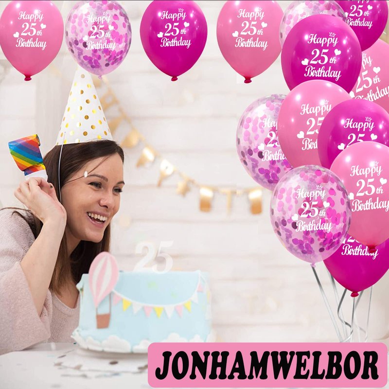 - 25th Birthday Balloon kit: Include 10pcs12inch Happy 25th birthday hot pink latex balloons,10pcs12inch Happy 25th birthday pink latex balloons,10pcs12inch Happy 25th birthday hot pink confetti balloons.