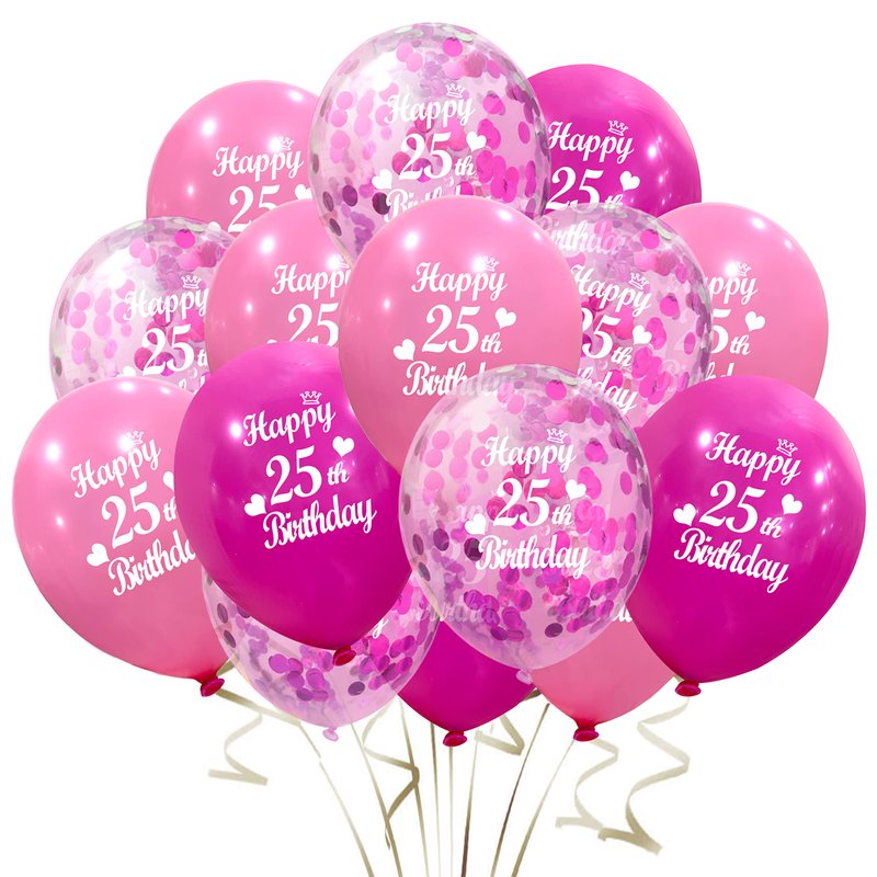 25th Birthday Balloon kit: Include 10pcs12inch Happy 25th birthday hot pink latex balloons,10pcs12inch Happy 25th birthday pink latex balloons,10pcs12inch Happy 25th birthday hot pink confetti balloons.