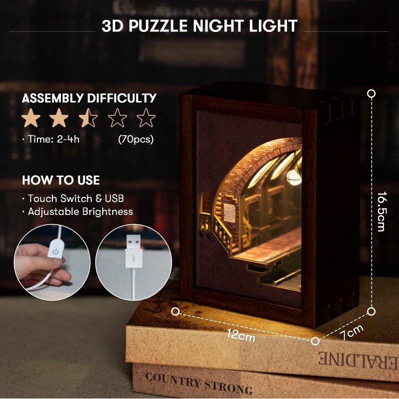 - [Premium Quality]This 3D wooden puzzle nightlight is made of high quality wood and with precisely laser-cut and clear print. Glue with needle tip is included. Also, dust cover is integrated in the front frame design. Warm and soothing LED lights brightness is adjustable enhancing the Miniature Wooden Lamp a more captivating sherlock holmes decor.