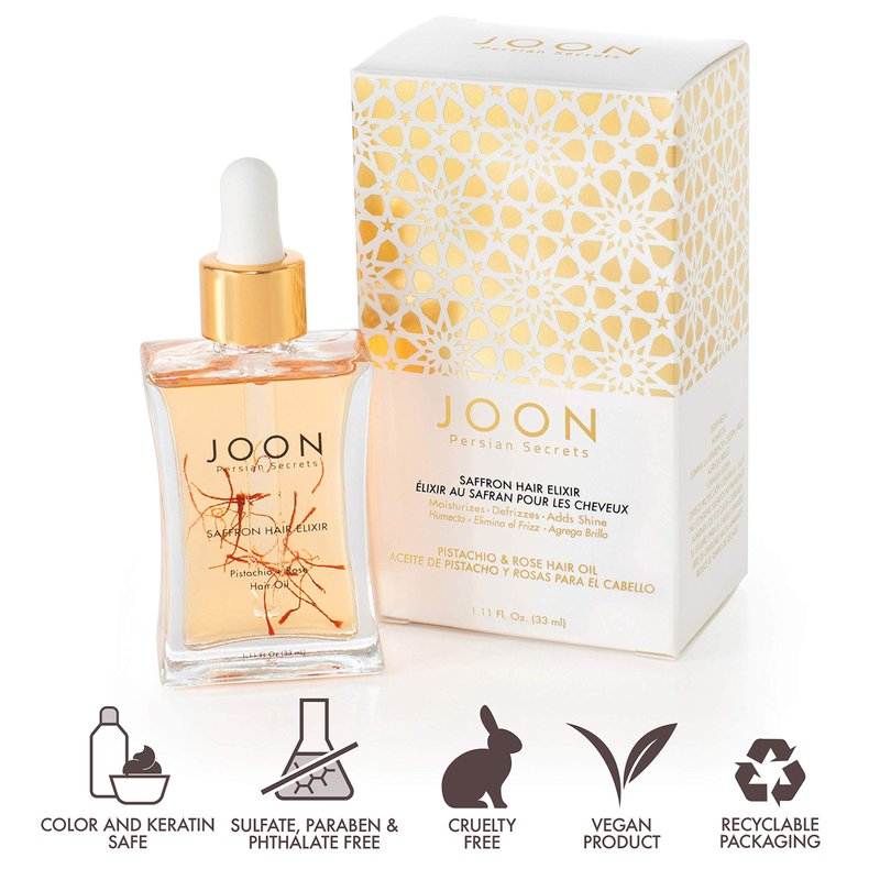 Joon is a haircare line that pairs ancient Persian secrets with modern chemistry for healthy hair. A lightweight, fast-absorbing hair oil that moisturises and detangles for frizz-free and shiny hair. Moisturizes, Defrizzes, Adds Shine, Detangles, Lightweight formulation. Put a few drops into your hand, rub hands together and evenly distribute product onto mid-shaft and ends. Persians have used Saffron, Pistachio and Rose in beauty rituals, for centuries. Saffron, a spice worth more than its weight in gold, is used to strengthen hair. Pistachio touts fatty acids, proteins and vitamins which nourish and moisturize for smooth, bouncy hair. Adored in Persian poetry and art, Rose has long been used to aid in hair repair. These unique ingredients, now combined by modern chemistry, give your hair a potent boost.