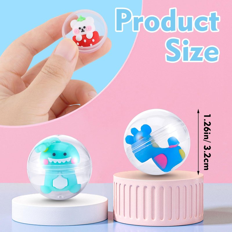 - Package Includes: you will receive 100 pieces of toy capsules in clear color, each mini capsule contains a cartoon toy that can be used as pencil toppers; These gumball balls toy is about 1.3 inches/ 3.2 cm