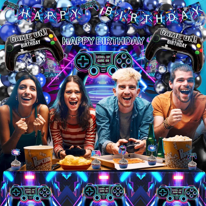 - Video Game Birthday Party Decorations---Including 1 happy birthday backdrop, 1 game tablecloth, 1 happy birthday banner, 1 cake topper, 12 cupcake toppers, 4 foil balloons, 80 latex balloons, 3 balloon tools, 103 in all.