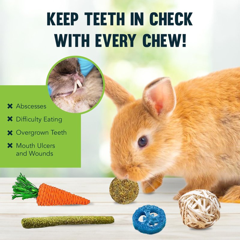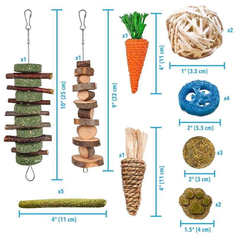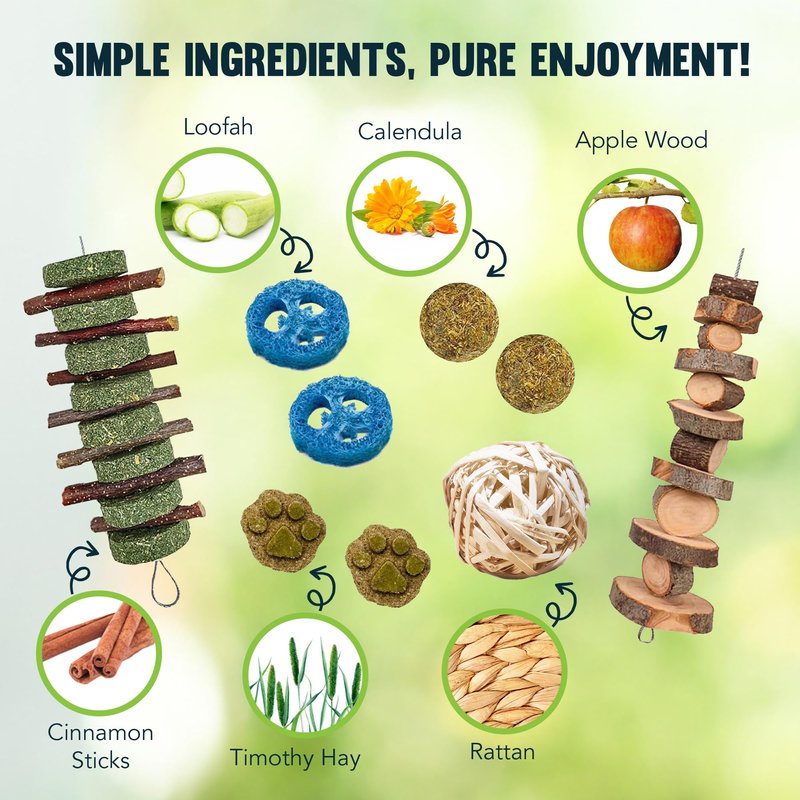 - Happy Tummies, Happy Bunnies --- Our munchies are fiber-rich and work wonders for your pet's stomach to be in tip-top condition. Each pack contains rattan carrots & balls, timothy hay (sticks & paw-shaped), cinnamon sticks with timothy hay pie, wood ladder, calendula balls and loofah slices that satisfy their taste buds. The combination of a wholesome blend ensures that your pets will be in prime condition for all the hopping adventures.