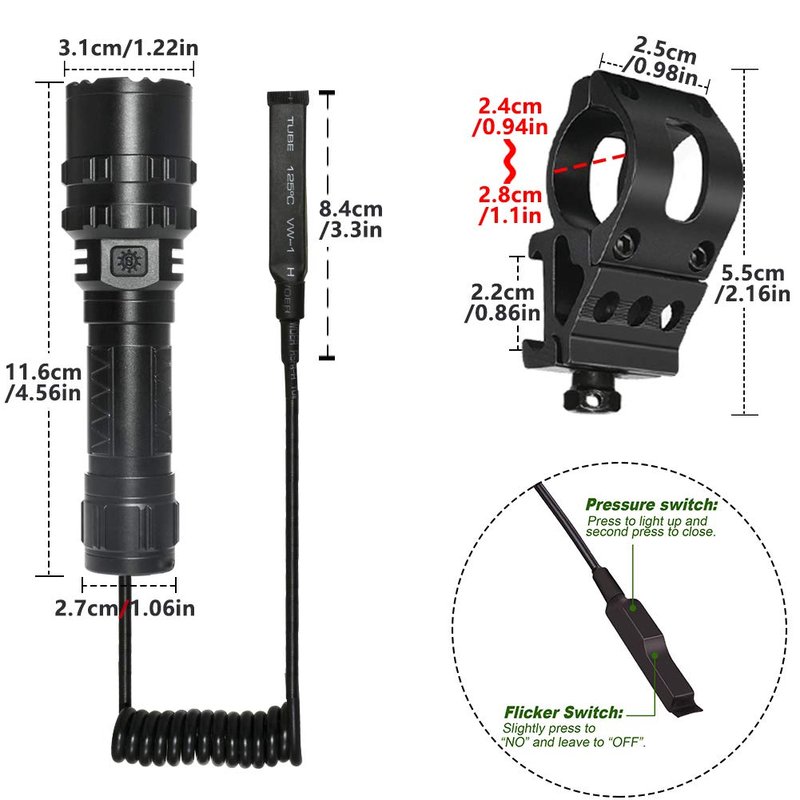 - There is a rail switch coming . Press the tail button to open or turn off the light, this is easy to control,when you are on playing outdoor tactical games.