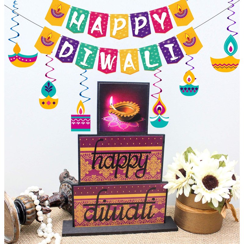 - Diwali Festival of Lights Party Decorations Kit includes Happy Diwali alphabets and 4 pieces candle banners.What’s more, there is also 7 Swirls with banner Cards. Perfect for the Happy Diwali Festival.