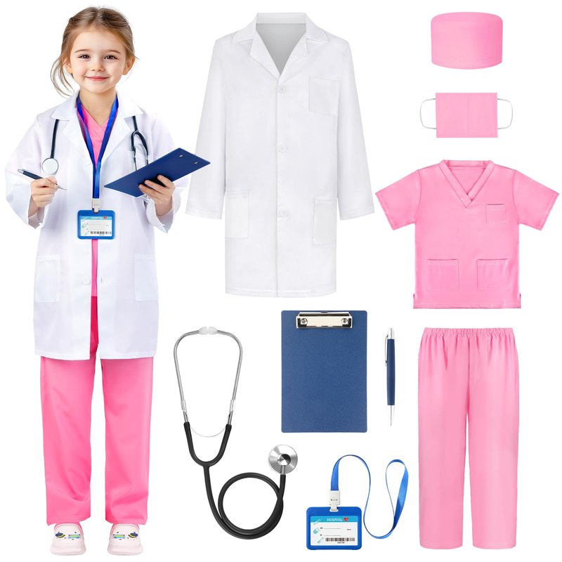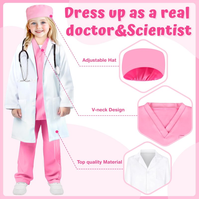 - Customized Doctor Costume for Kids: Transform kids into a real little doctor with our comprehensive girl Halloween doctor costume. Designed for boys and girls aged 3 to 12, it features pink, rose pink,and green colors. The complete doctor costume set includes a doctor lab coat, kids scrubs, surgical mask, hat, realistic stethoscope toy, medical records, and a name card. Perfect for imaginative play, or Halloween costumes for girls boys, this doctor costume ensures hours of fun and learning