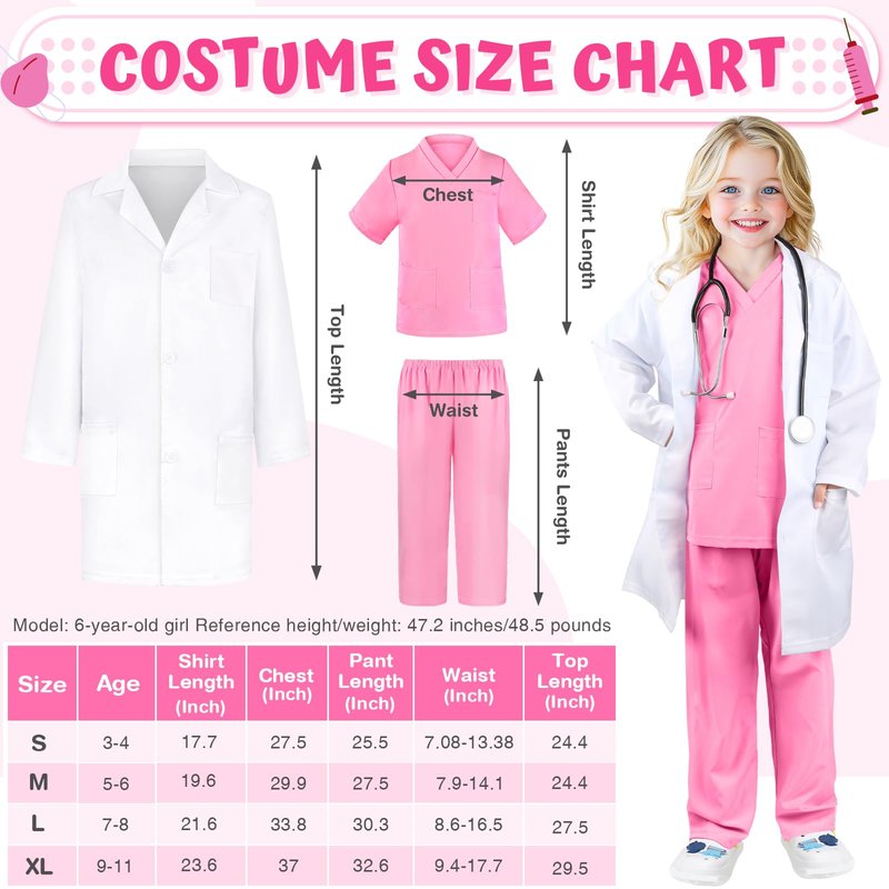 - Quality & Soft Material For Kids: Our kids scrubs for girls are made of soft and breathable materials. This Kids doctor costume features a V-neck with front pockets, paired with elastic-waist pants. We offer 4 sizes of this kids lab coat and kids scrub. We have marked the height and weight range suitable for what size. Please choose the appropriate size refer to the picture. Pretend playing games with these real doctor dress up for kids will make children more engaged and happy all day long