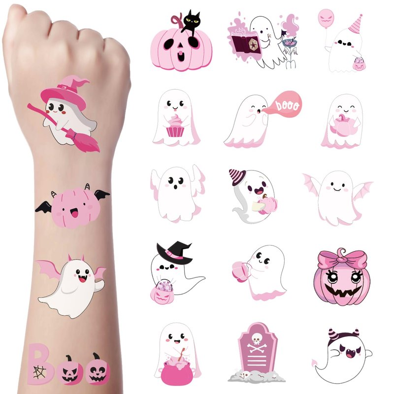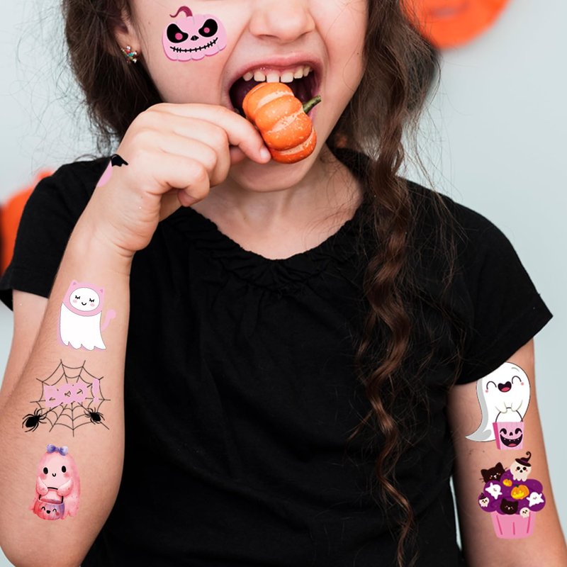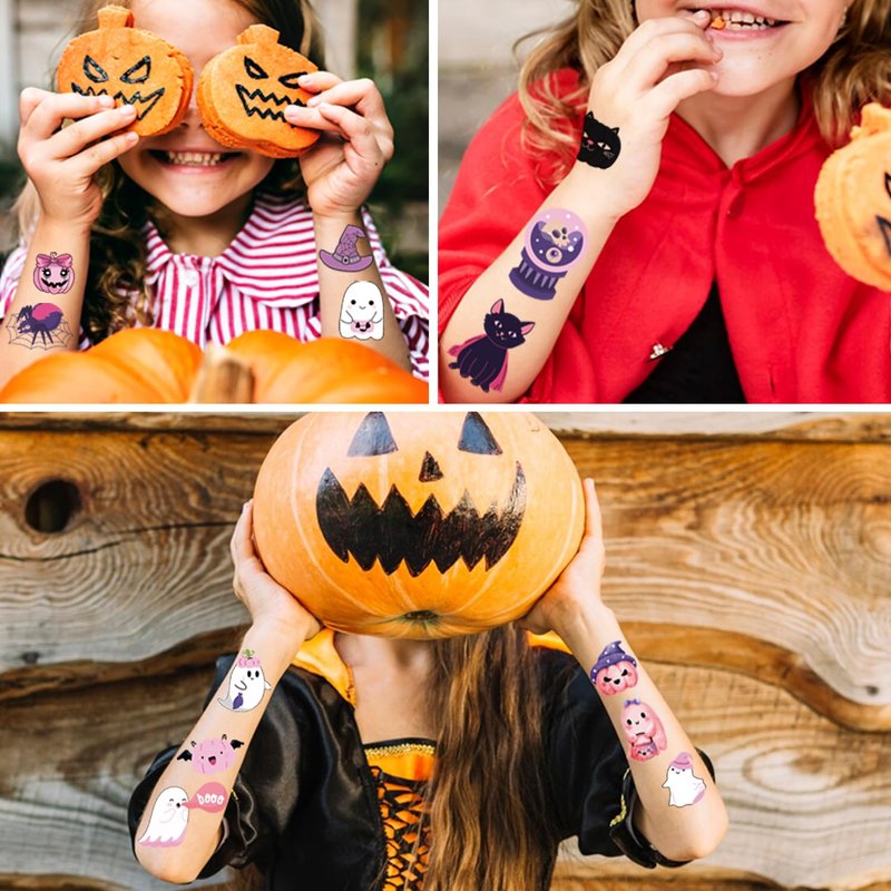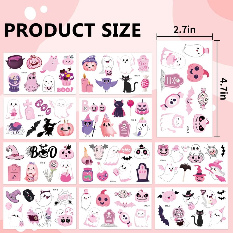 - Let your kids have enchanting fun with our 10 happy pink Halloween tattoos, each measuring 2.7*4.7 inches. Comes in a variety of cute styles, perfect for Halloween party decorations. These temporary tattoos are plentiful and have charming designs that will allow children to create cherished memories and take unique photos during their celebrations.