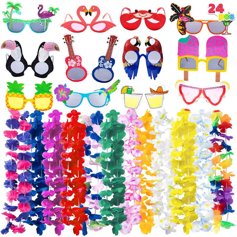 - SUPER VALUE PACK:24Packs with 12 pieces flower leis necklaces, 12 pieces luau party sunglasses,leis and glasses come in a great assortment of colors and styles