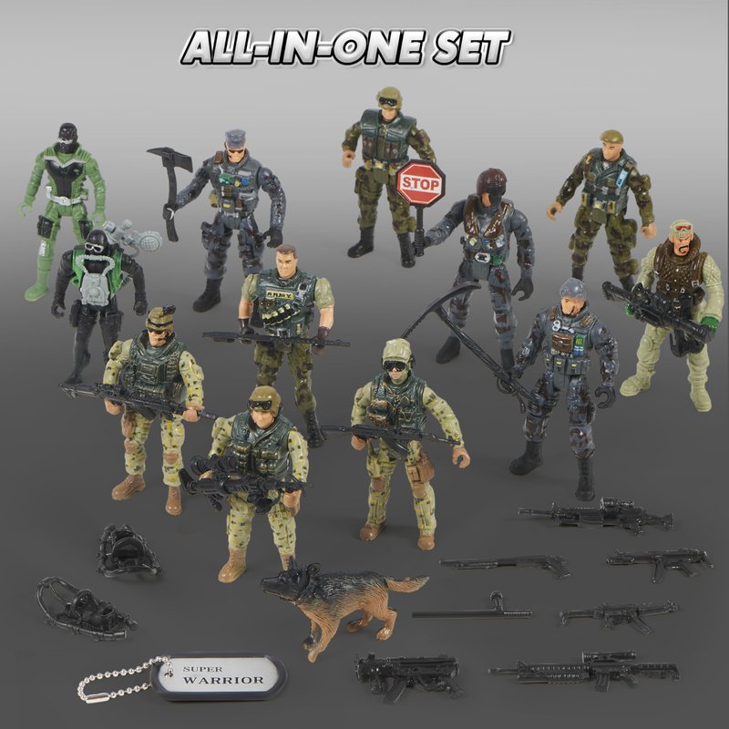 SUPER VALUE PACK. Our action figures comes in 12 packs in three color theme: Army, Marine, and Special Police, 2 fortification figures, 1 dog figure, and 1 name tag. Every men action figure (4 inches) is in a unique realistic design.