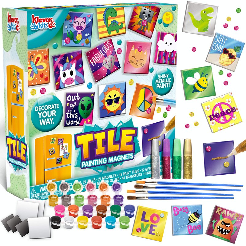 Klever Kits 24 Magnetic Mini Tiles Art Kit Creativity DIY Paint Arts & Crafts DIY Supplies Kit Make Your Own For Kids, Fridge, Locker, Party Favors, Craft Project Gifts for Boys & Girls, Family Activity, Birthday Present