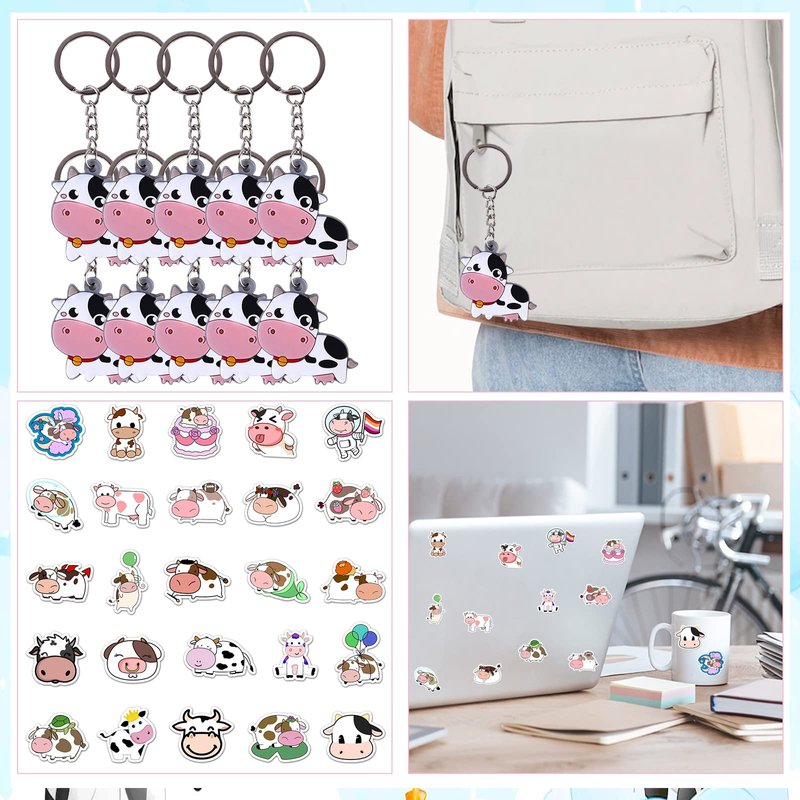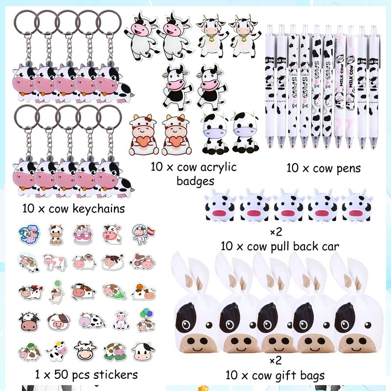 - What You Will Get: You will get 10 cow treat goodie bags, 10 cute cow Keychain, 10 cow print black press pens, 10 cow Pull back cars, 50 pieces stickers, and 10 cow badge.
