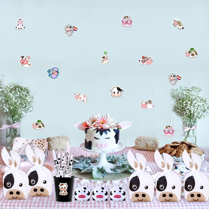 - Cute Cow Party Supplies Set: You can use these cute cow stickers to decorate your laptops, water bottles, refrigerator, guitars, smartphones, etc. And these cow themed decorations can also be widely applied to decorate your room, party, cakes, and so on.