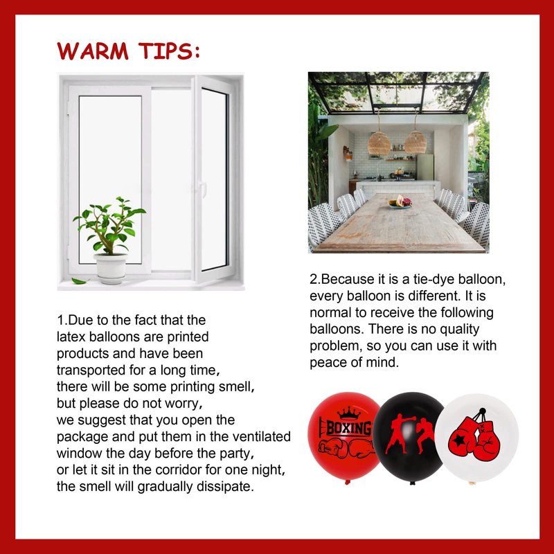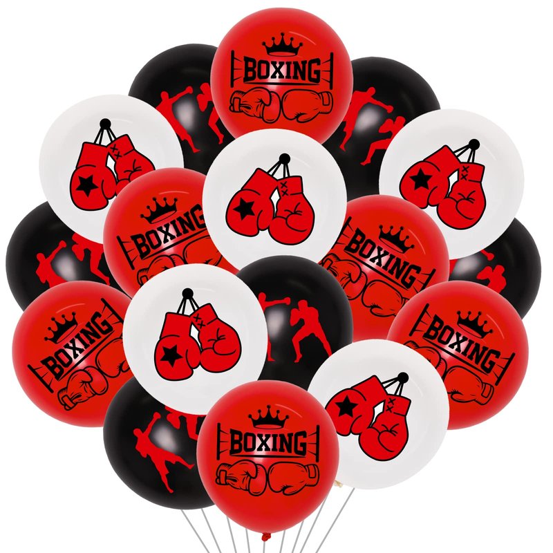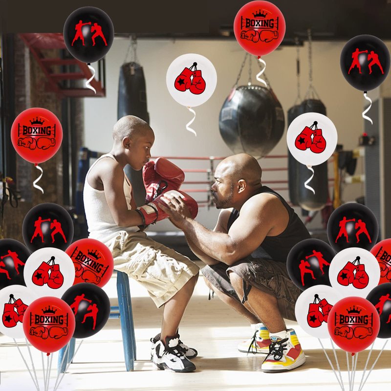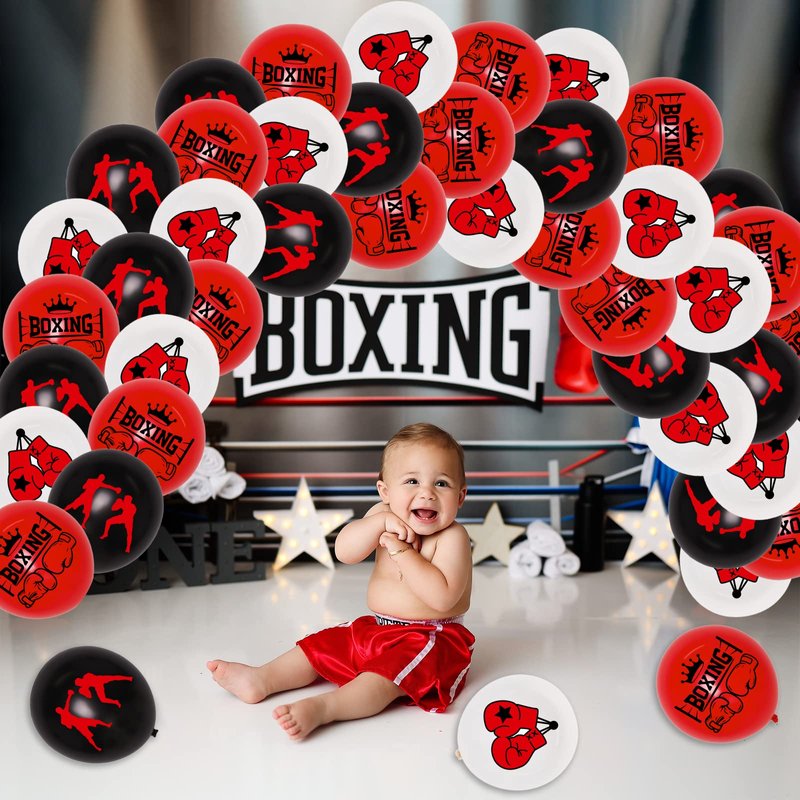 - Boxing Party Balloons: You will receive 40 pieces balloons 12 inches with Boxing theme, including 15pcs red printed, 15pcs black printed and 15pcs white printed. These beautiful entertaining balloons are perfect for boxing match party decorations.