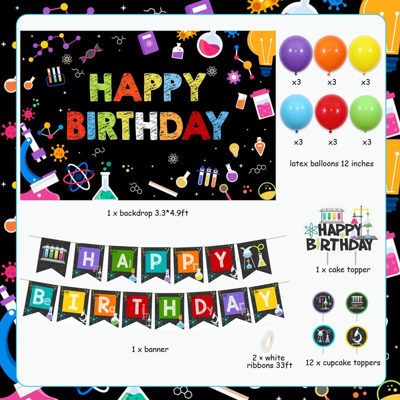3 x 12 inch yellow latex balloon 3 x 12 inch purple latex balloons 3 x 12 inch orange latex balloons 3 x 12 inch light blue latex balloons 3 x 12 inch green latex balloons 1 x ”happy birthday” backdrop 3.3*4.9ft 1 x ”happy birthday” banner 1 x sicence cake topper 12 x science cupcake toppers