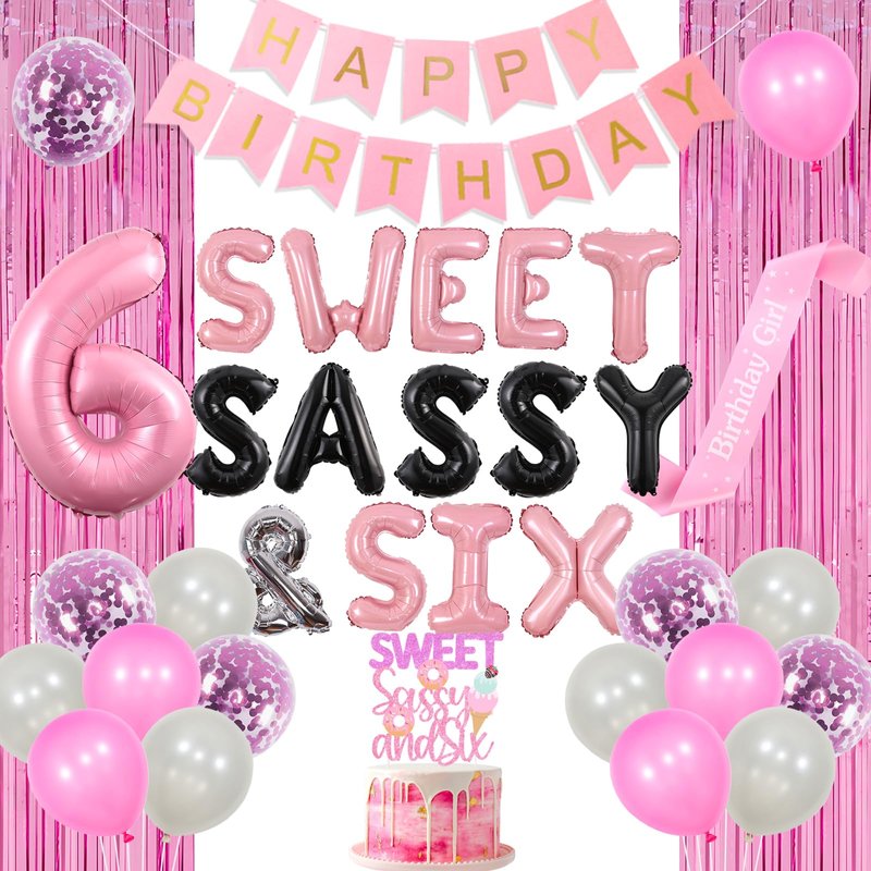 - Sweet Six Birthday Party Decorations: Package includes 15*12 inches latex balloons, 1 “HAPPY BIRTHDAY” banner, 1 “sweet sassy and six” cake topper, 1 “Birthday Girl” sash, 1*16 inches “SWEET SASSY & SIX” foil balloons, 1*32 inches number 6 foil balloon, 1 pack of fringe curtain 3.3*6.5ft and 2 white ribbons 33ft.