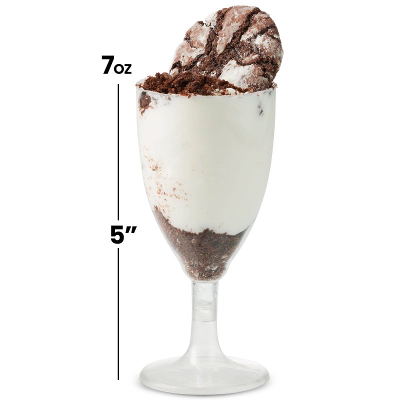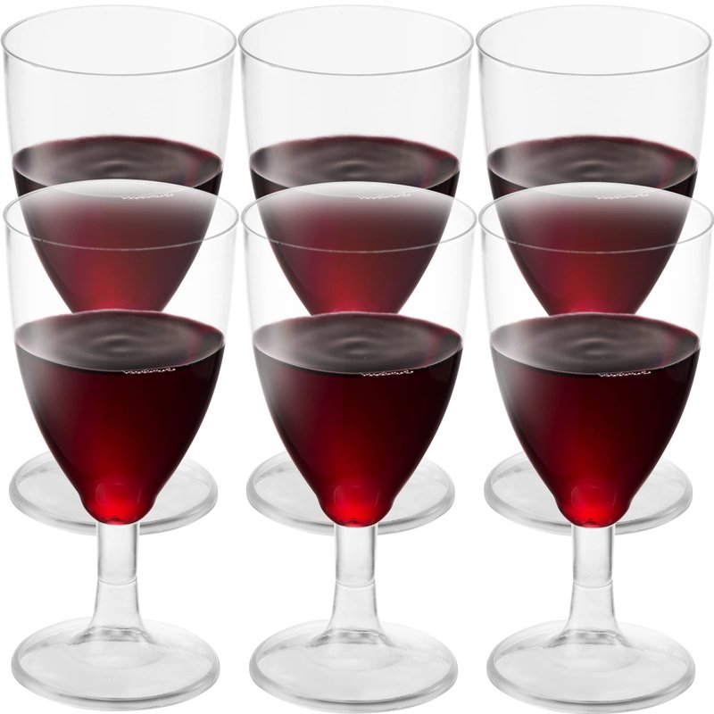 - PACK OF 24. 7 OZ - CLEAR DISPOSABLE WINE GLASSES: This set of disposable wine glasses comes in a pack of 25 - 5.5" tall wine glasses with stems. With a 7oz capacity, these disposable wine goblets are suitable for drinks and desserts. Disposable for easy cleanup.