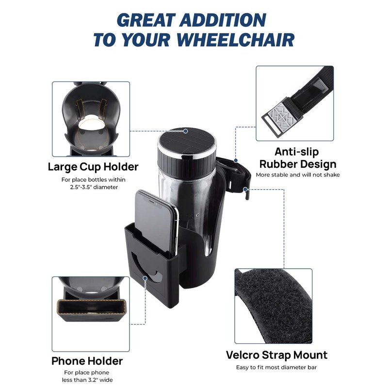 - 【2 In 1 Cup Holder】Only for 2.5"-3.5" diameter of the beverage cup and 3.2" width 0.6" thickness phone(It is recommended to place the phone without a phone case). Upgrade 2 in 1 wheelchair drink holder with a phone bracket. Buy it you have both a cup holder and a phone holder. You can enjoy your beverage while playing on your mobile phone.