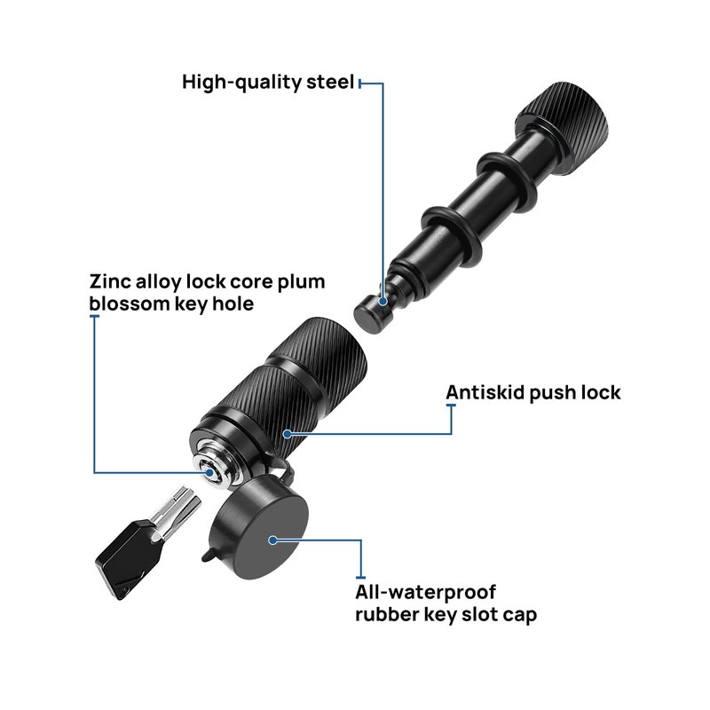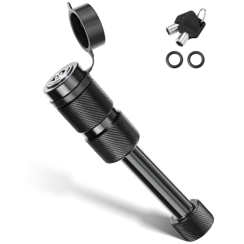 - 【PREMIUM MATERIAL】 The trailer receiver lock uses black electrophoretic painted carbon steel, solid and hard to bend. 360 degree rotating head, easy to handle. All-weather rubber key slot cap keeps the keyhole away from moisture, dust and rust. Updated tubular key hole, zinc alloy lock core.