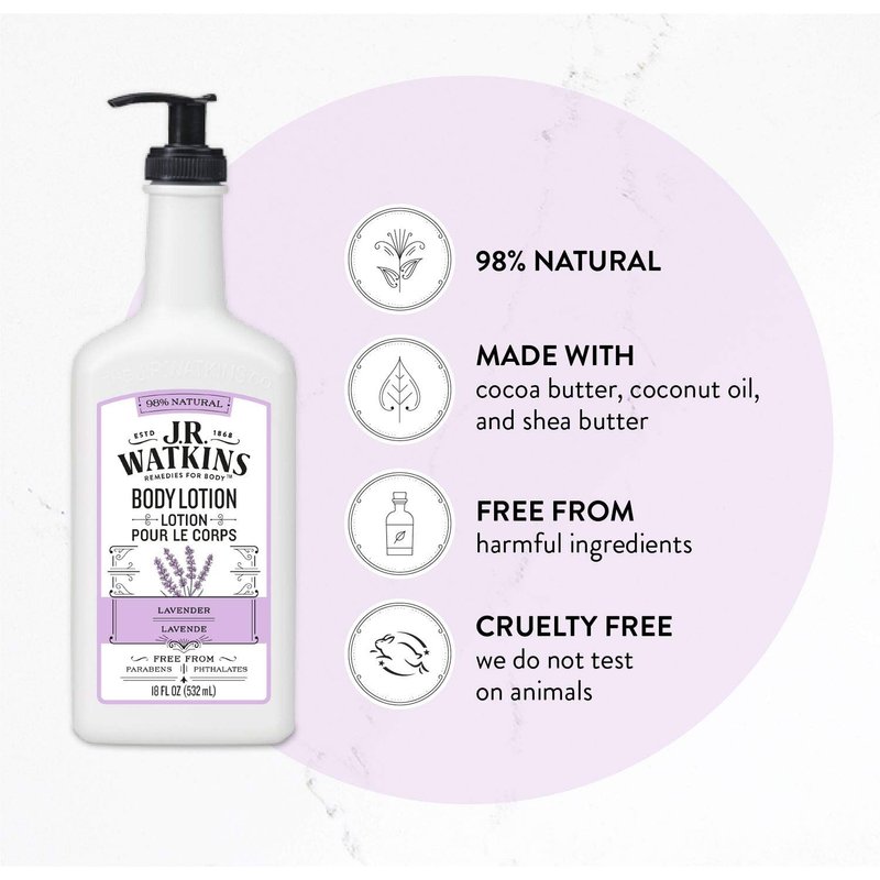 - LAVENDER BODY LOTION: J.R. Watkins moisturizing body lotion leaves skin soft and smooth all day long. The gentle lavender scent will leave your skin feeling hydrated and smelling fresh and clean.
