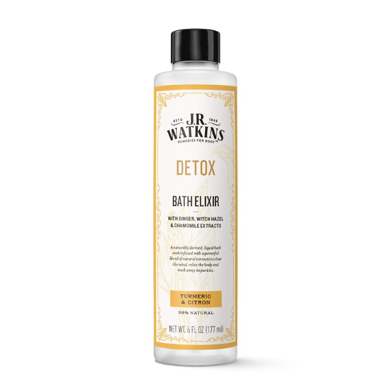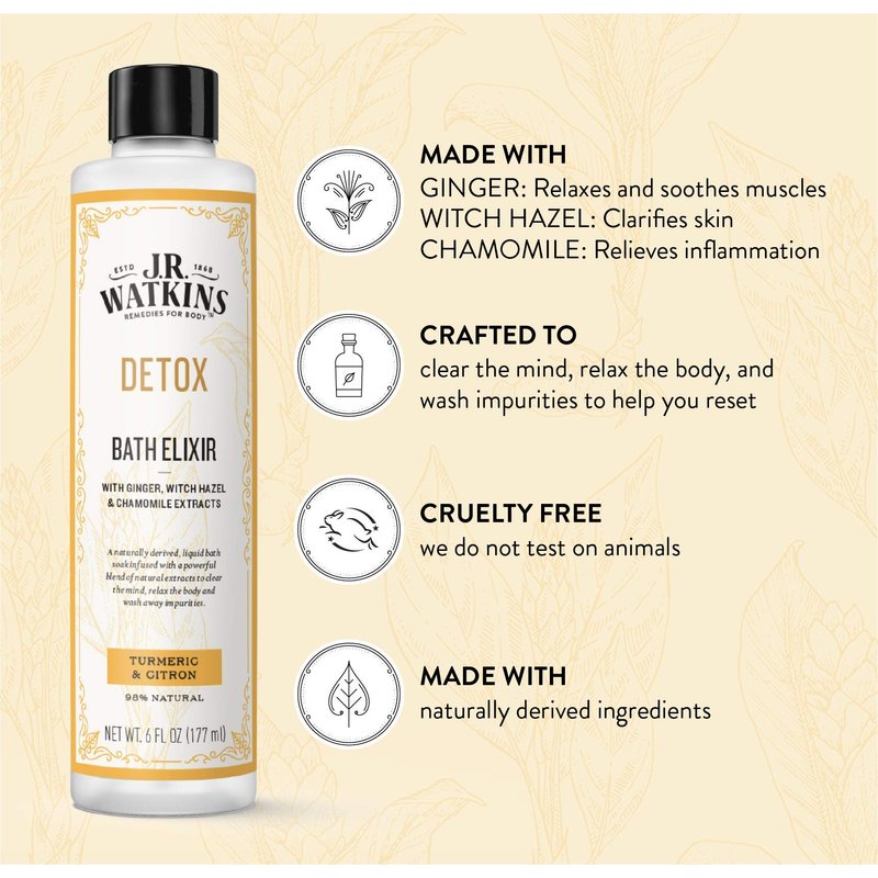 - Luxurious Bath Soak: J.R. Watkins DETOX Bath Elixir is a naturally derived liquid bath soak that gently detoxes with powerful, naturally derived extracts. No residue, just clean extracts to clear your mind, relax your body, and wash away impurities.