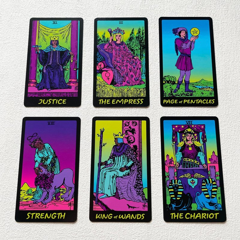 Colorful Neon Tarot Deck revives the colors to be more eye-catching while preserving the authentic identity of timeless tarot art. Strong and durable, easy to use - whether your tarot reading interest is just blossoming or you are ready to launch your tarot reading business. Follow from the heart to foresee the future, you will get stronger will and firmer goals in the world of tarot