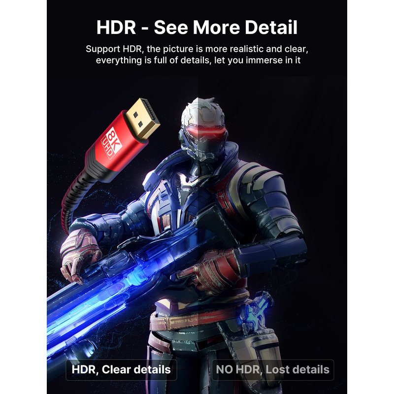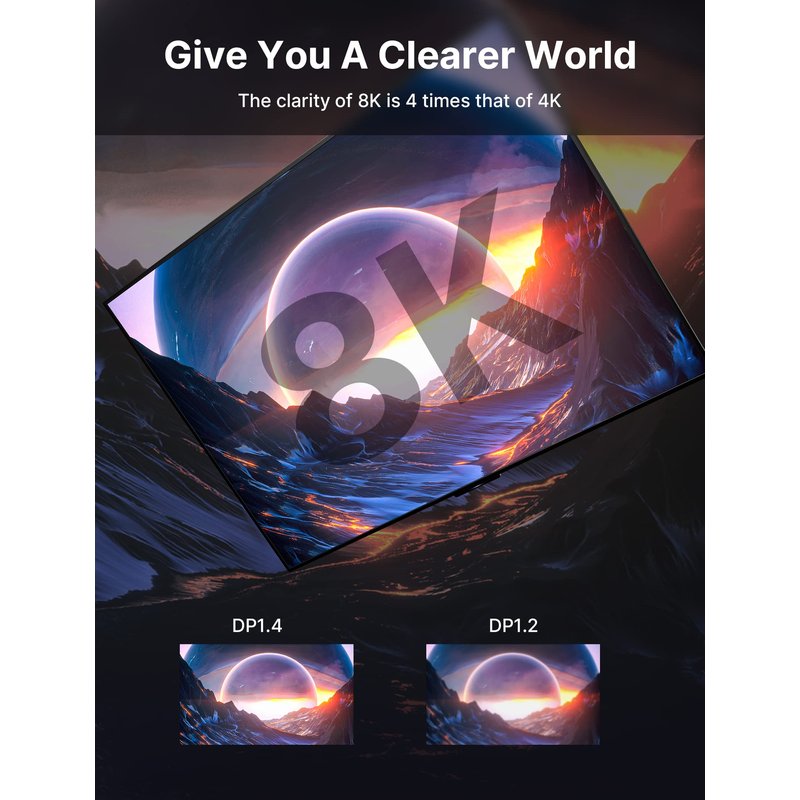 8K DisplayPort 1.4 Cable: Supports transmission speed up to 32.4Gbps Bandwidth, resolution up to 7680x4320, refresh rate up to 8K@60Hz, 5K@60Hz, 4K@144Hz, 4K@60Hz, 2K@240Hz, 2K@165Hz and HDCP 2.2, HDCP 1.4, HDR. Backward compatible with DisplayPort cable 1.3/1.2.