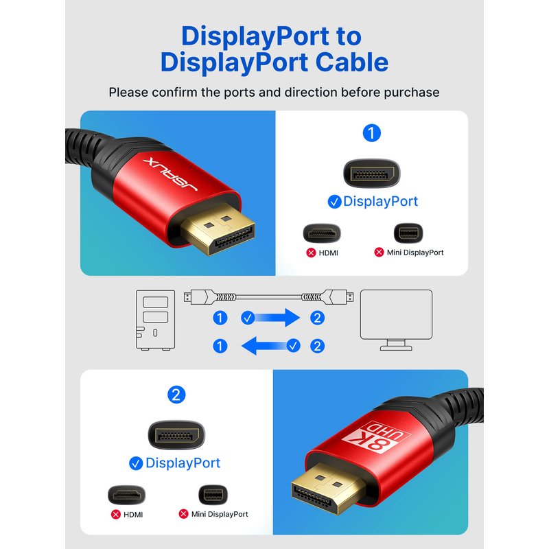 FPS-Gamer Friendly: JSAUX DisplayPort cable 1.4 supports resolution up to 8k 7680x4320 at 60Hz, 4K 3840x2160 at 144Hz and 2K at 165Hz, ideal for Large game and Ultra HD video streaming, translating a smoother and nicer gameplay.