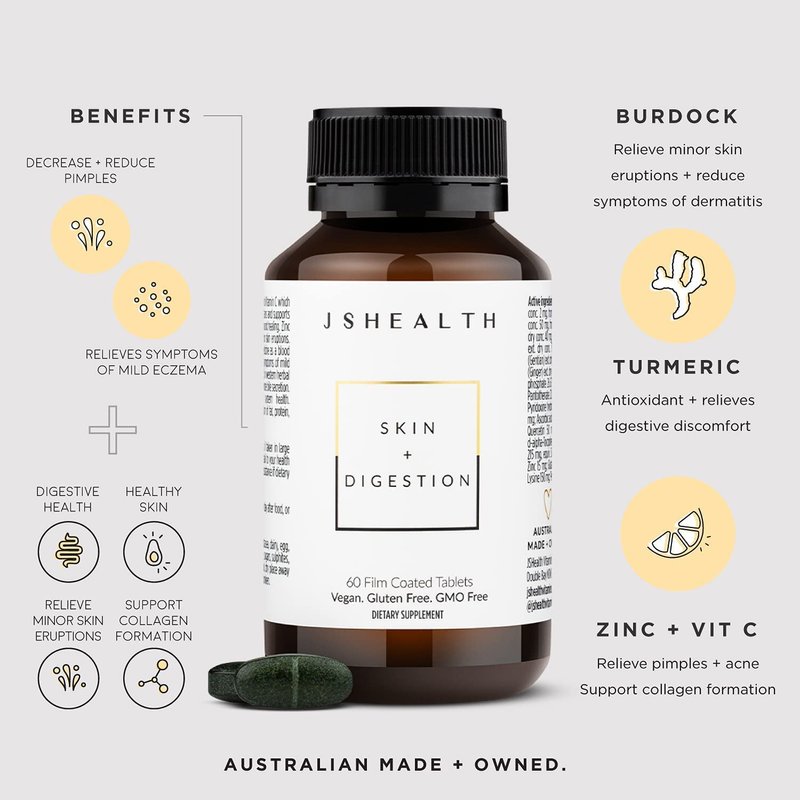 JSHealth Vitamins Skin and Digestion Tablets: JSHealth Vitamins was founded by Jessica Sepel, a clinical nutritionist, best-selling author and one of Australia’s most sought-after health and wellness experts. Two years ago, the JSHealth team embarked on a journey to create a unique formula to support healthy skin as well as aiding digestion. Say goodbye to fad trends and gimmicks; this formula is backed by years of clinical research and is proven to work. JSHealth Vitamins Skin and Digestion combines essential vitamins and minerals and Western herbal medicine ingredients for obtaining best results. VITAMIN B2 and VITAMIN C: Supports skin and connective tissue health. Aids collagen formation and wound healing. ZINC: Relieves the symptoms of acne, pimples, and minor skin eruptions. Maintains and supports gastrointestinal system health. BURDOCK: Traditionally used in Western herbal medicine as a blood cleanser and to relieve minor skin eruptions and symptoms of mild eczema and dermatitis. TURMERIC: Traditionally used in Western herbal medicine to relieve digestive discomfort and to promote bile secretion Our formula is designed to be a very convenient part of your everyday health routine. These minerals and ingredients may be hard to obtain from diet alone. One tablet twice daily with meals is all you need to supplement your health and wellbeing.