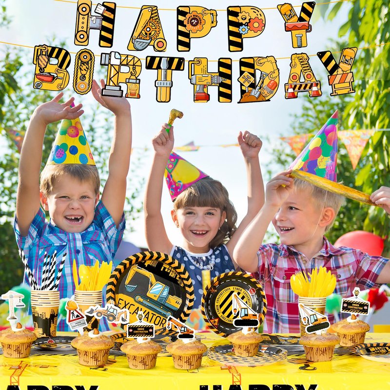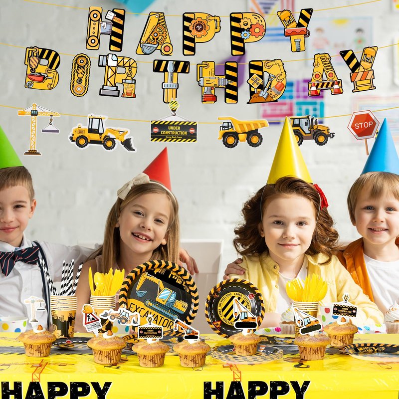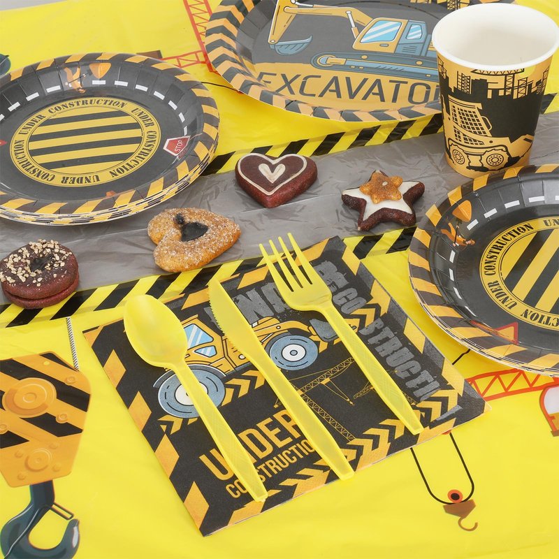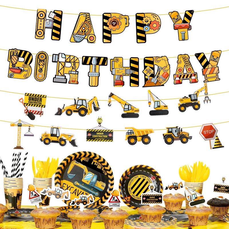 - Package: Get 194 construction birthday party supplies including dinner plates, dessert plates, cups, cutlery, napkins, straws, cupcake toppers, table cover, birthday banner, and truck banner for a complete setup