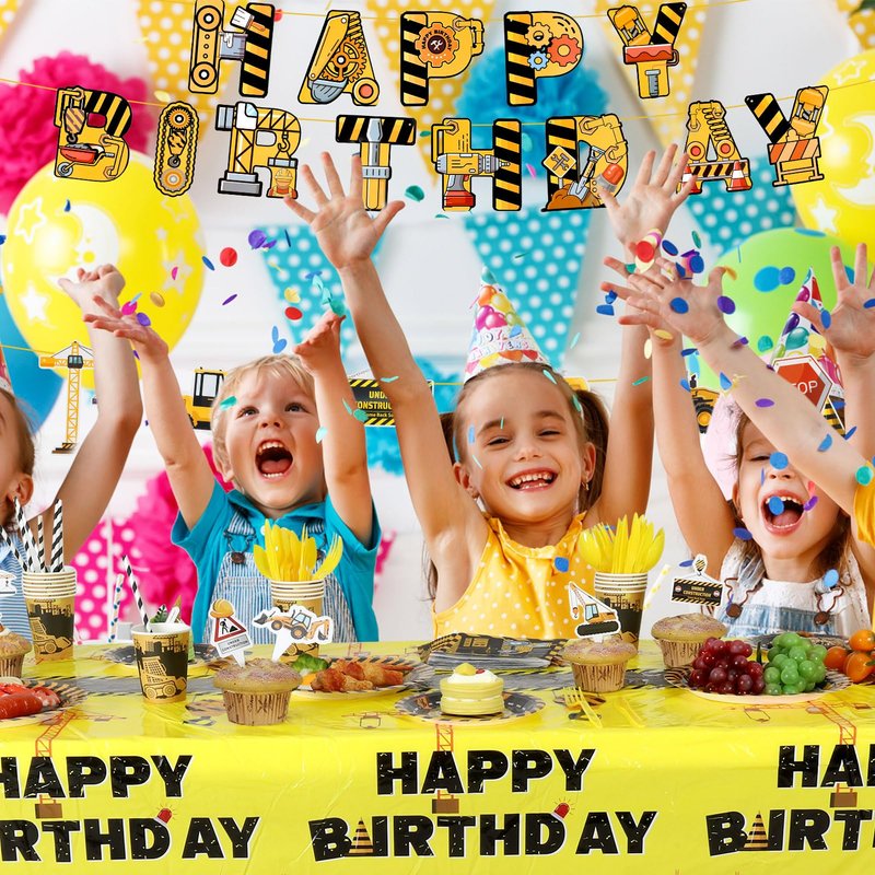- Effortless Setup: Streamline party preparations with charming construction illustrations. Easily display the pre-assembled birthday banner on any surface and arrange the table cloth, plates, and setup for a convenient and efficient celebration