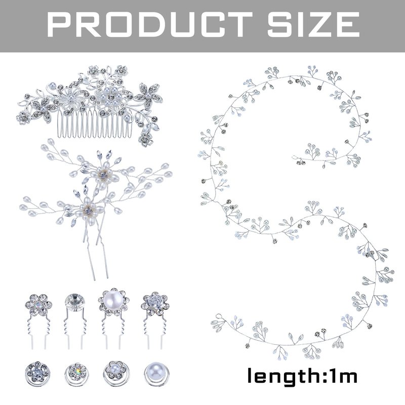Features:Applicable occasions:The bridal hair accessories can be worn on various occasions such as wedding ceremonies, birthday parties, dating, shopping, photography, performances, role plays and other formal or informal places.Handy to wear:The rhinestone hair accessories are lightweight, easy to store in your handbag, portable to carry around, handy and proper for you to wear anytime and anywhere.Specifications:Color: as pictures shownSize: Hair vine: about 1 m/ 39.4 inches longPackage includes:1 x Hair vine2 x U shape wedding hair pins24 x Spiral hair pins1 x Bridal side comb20 x Pearl flower updo forksNotes:Manual measurement, please allow slight errors on size.The color may exist slight difference due to different screen displays.The pointed parts may include, please use them carefully.