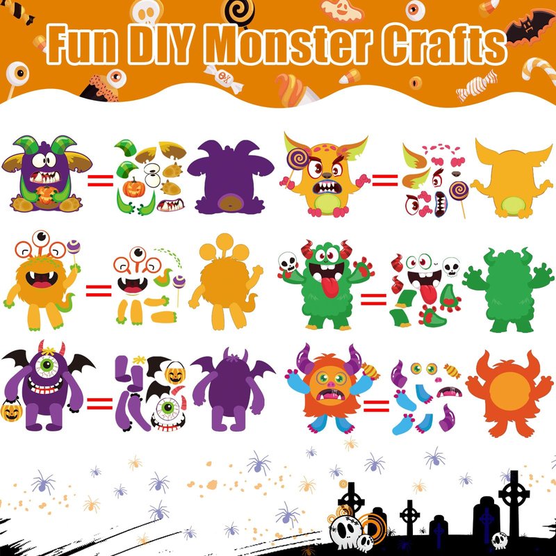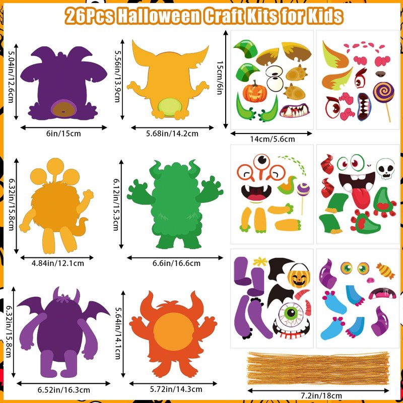 - Halloween Monster Craft Kits: Make your own monster kits include 26 unfinished Halloween monster cards, 26 colored string, and 26 stickers. Monster cards measure approximately 13 x 12 cm /5.1 x 4.7 inches. Our monster cards are available in 6 styles. The rich styles of our kids crafts are enough for your children to make their own Halloween crafts