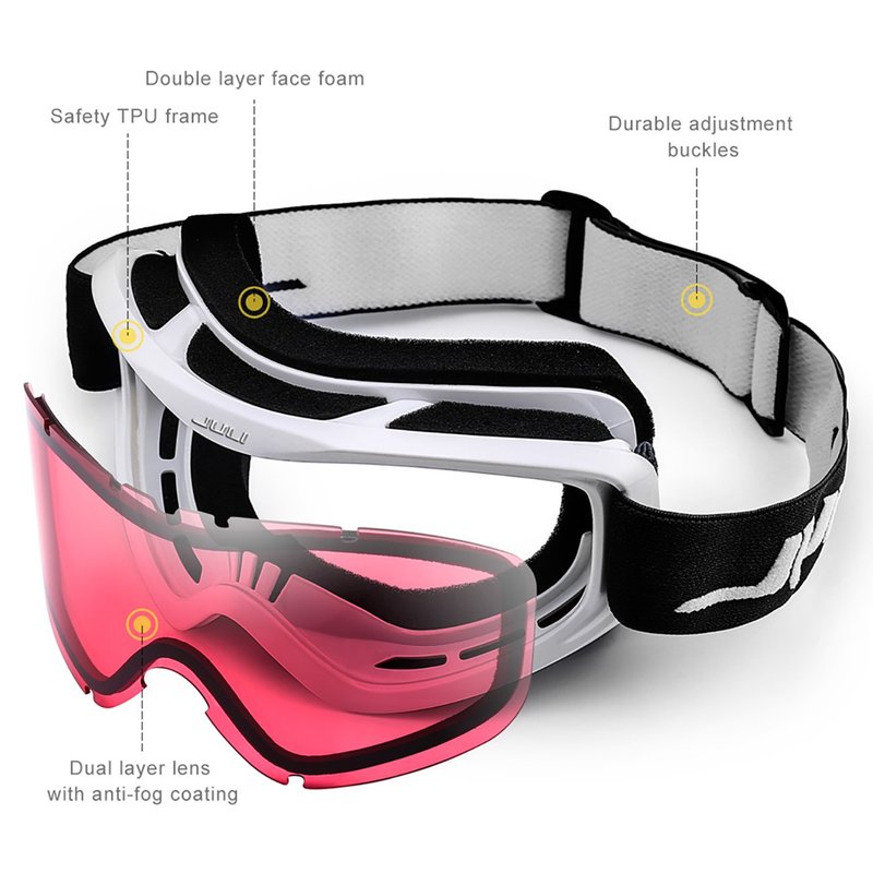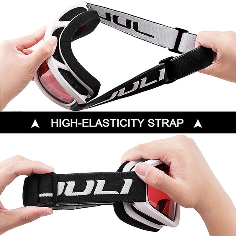The JULI ski goggles featured with double lens made of solid PC material which came with unique material anti-fogging treatment and 100% UV400 protection that cuts the glare.