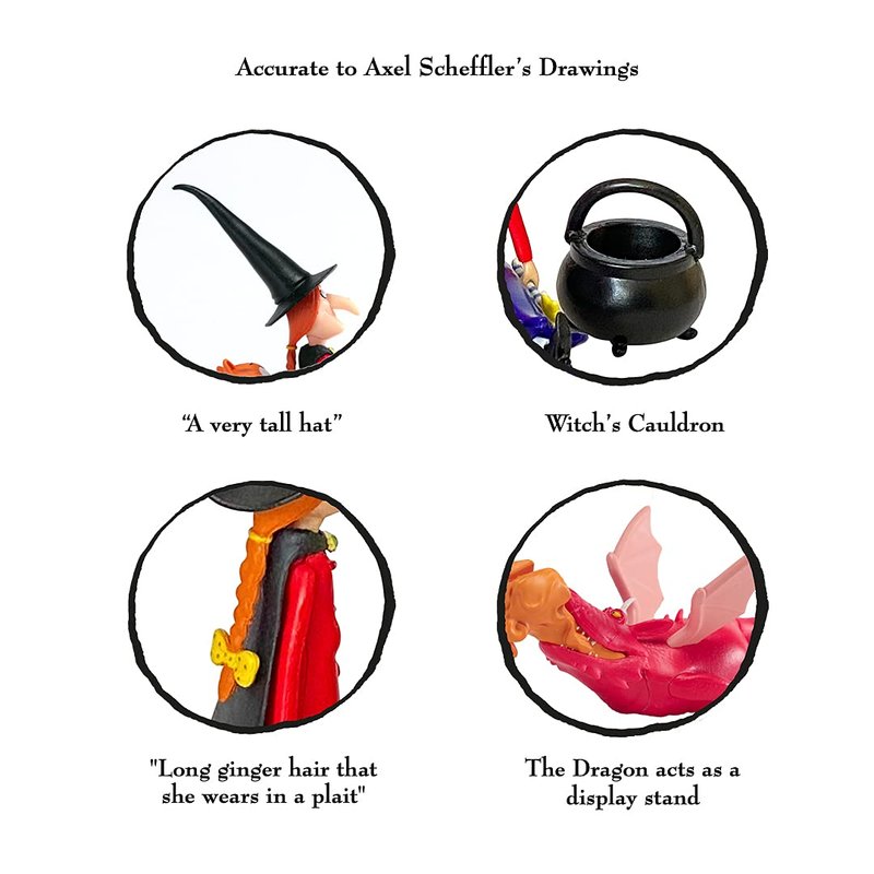 - THE COMPLETE COLLECTION -- Recreate the magic of Julia Donaldson and Axel Scheffler's picture book adventures with your very own offical character figurines. This is the full set: The Witch and broomstick with her cauldron, along with Cat, Dog, Bird, Frog and Dragon