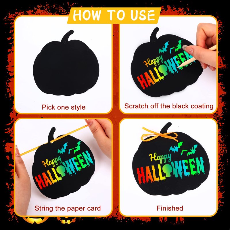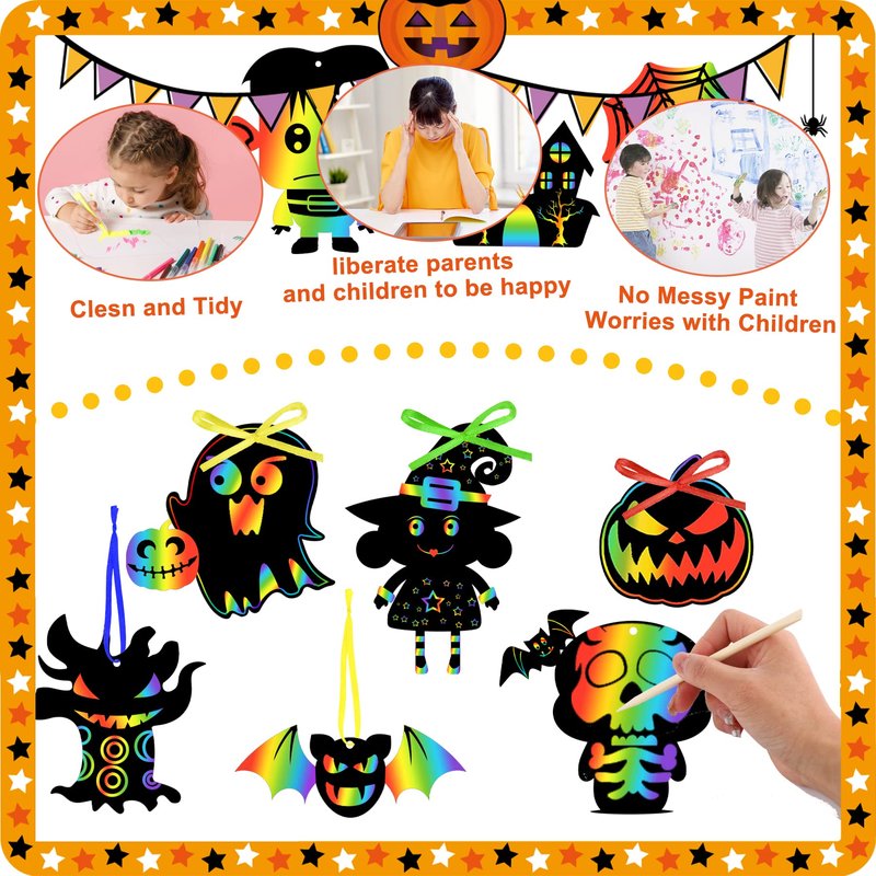- 🎃Safe Material: Our Halloween scratch papers are made of quality thick paper, which is not easy to tear. The magic rainbow colors and patterns are hidden under the matte coating. Scratching sticks are made of wood, which are not easy to deform, please rest assured to use.