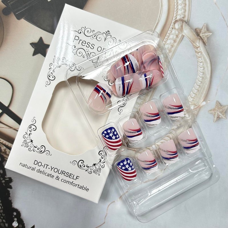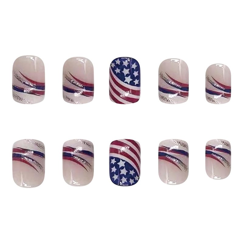 - 【Independence Day Fake Nails】July 4 independence Day acrylic nails press ons are made of good acrylic ABS material, more glossy, firm and not fragile, softness is similar to human nails, comfortable and natural. You can use it with confidence.