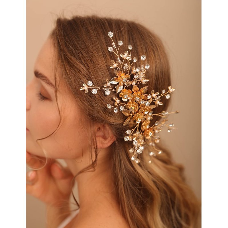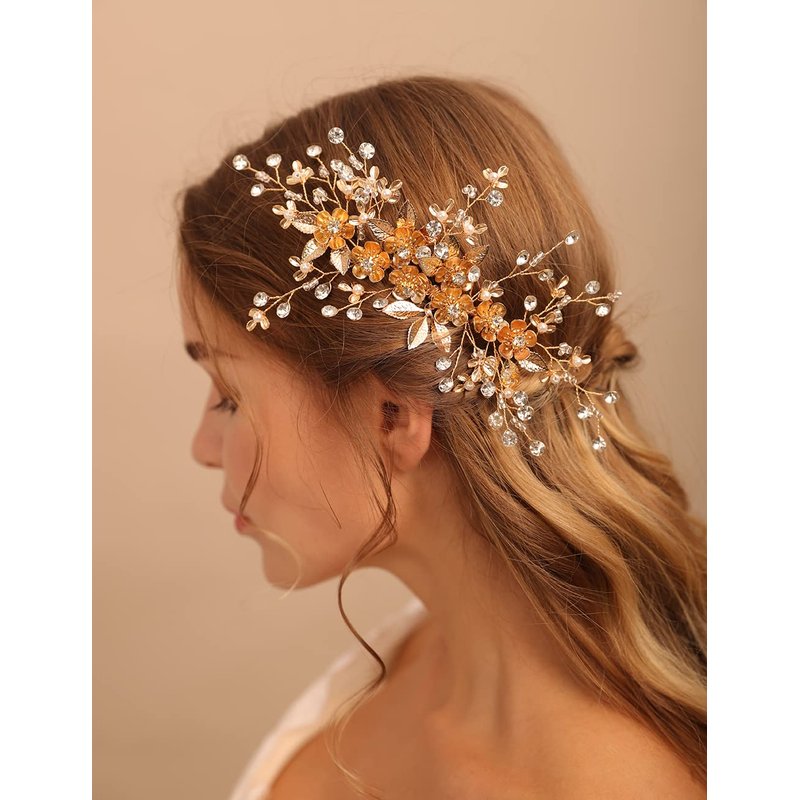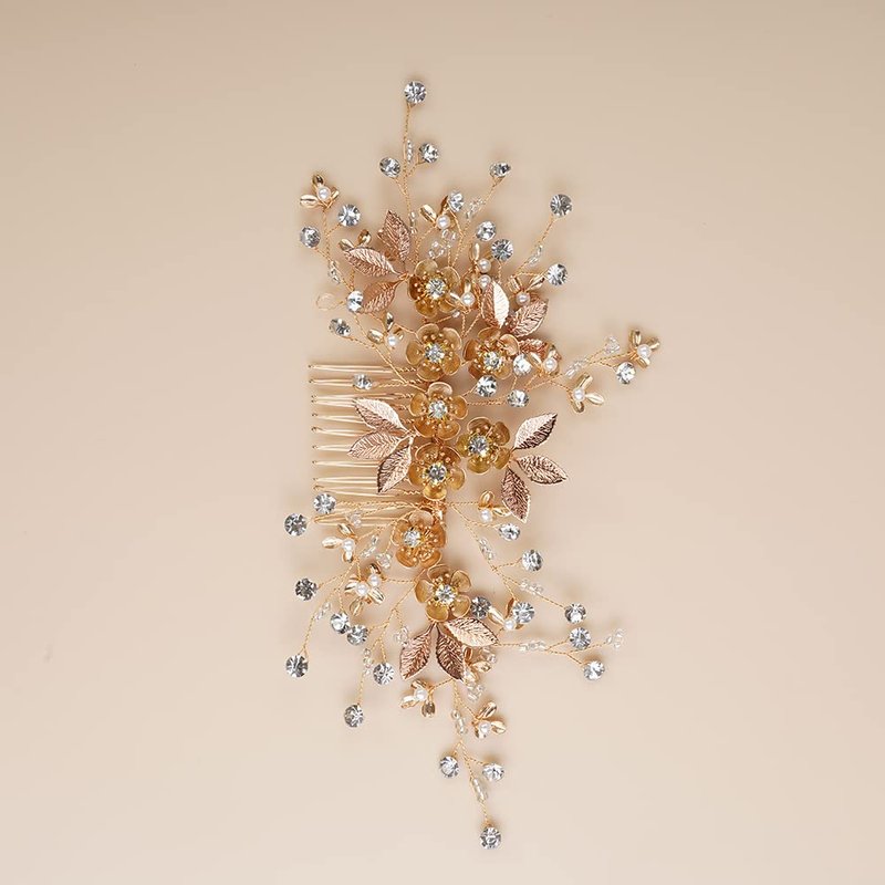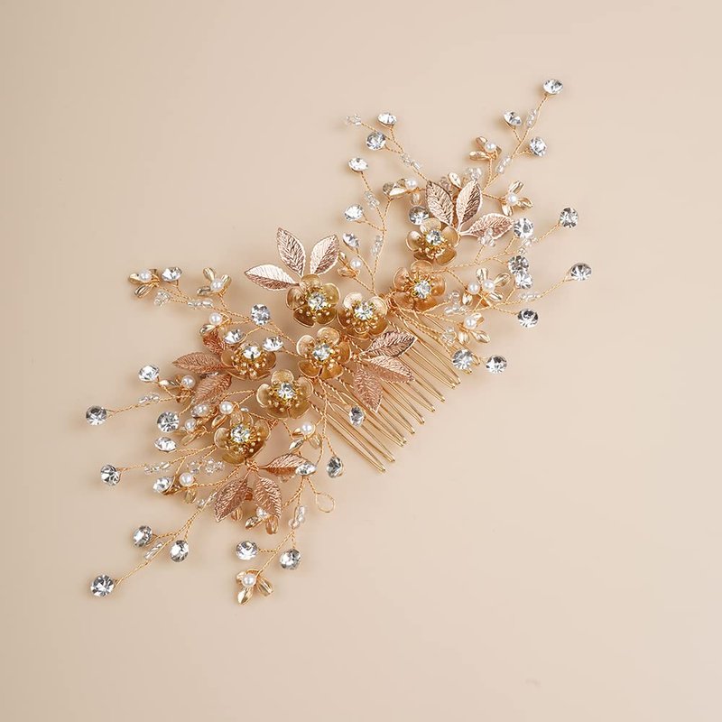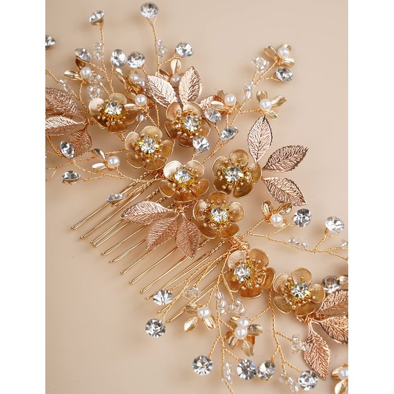 Jumwrit Bridal Hair Comb Rhinestone Crystal Headpiece Handmade Flower Leaves Pearl Hair Comb for Bride Bridesmaid Wedding Hair Accessories for Women Girls(Gold)