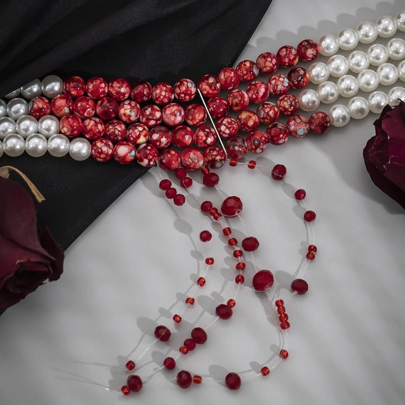 Jumwrit Vintage Layered Pearl Choker Necklace Chunky Chain Multi Strand Pearl Beaded Necklace Rhinestone Crystal Tassel 4 Tier Halloween Vampire Necklace Statement Accessories for Women (Red)