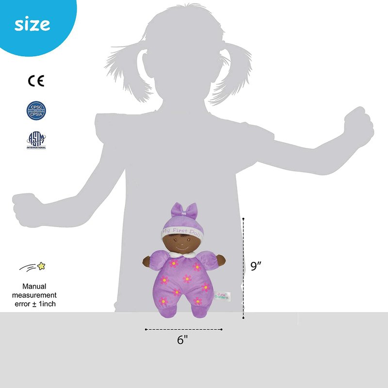 Here comes the adorable My First Doll Hazel! Featuring embroidered adorable facial details and printed cute floral patterns on her purple pajama, hazel makes a perfect baby shower gift for newborns, toddlers and preschoolers. Little babies love to touch and chew on anything they discover. With embroidered eyes, nose , sweet smiles and a sewn-on hat, this toy is baby-safe. Featuring a sewn-in decorative bow and integrated plush body, babies can play safe without worrying about small parts safety issue. Our baby doll measures approximately 8”tall, which is the perfect size for little hands to hold onto and hug. Thanks to the lightweight, the doll fits nicely in any bags and strollers, making it a great travel companion for babies. This cuddly doll is loosely stuffed with soft pp cotton, perfect for soothing any child from birth and up. Hazel not only provide babies with a sense of comfort and security, but also develop baby's social skills and emotional abilities. Through the actions of touching and hugging, boys and girls gain precious experience of role plays throughout early childhood. Baby is sure to love this doll for years! A June Garden toy is manufactured strictly in accordance with ASTM and EN71 standards. With over 20 years of experience manufacturing plush toys, June Garden has been committed to design quality toys that inspire wonder and curiosity.
