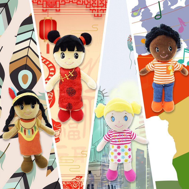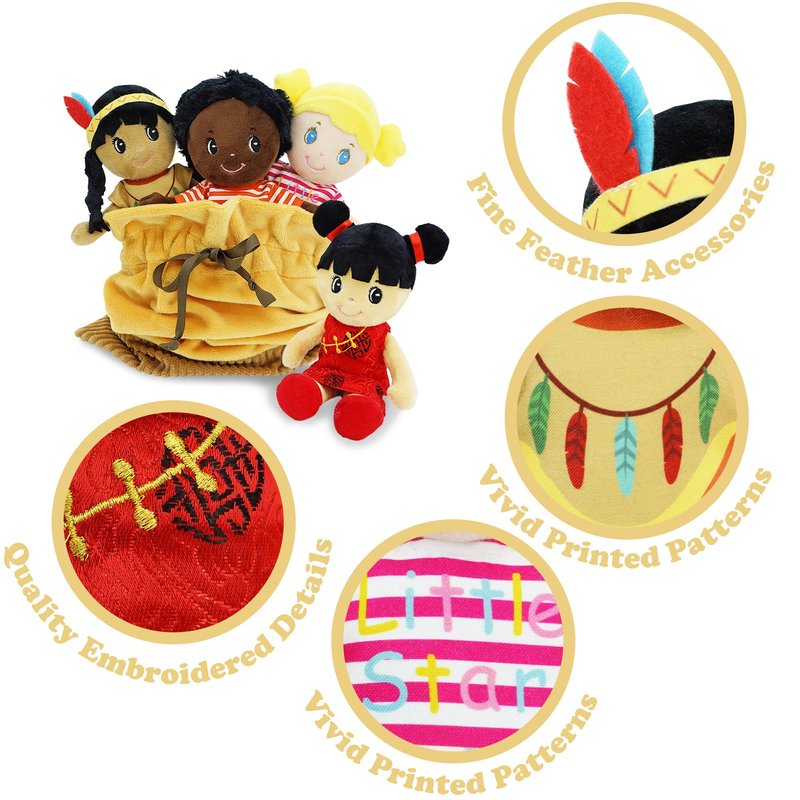 - MULTICULTURAL DOLL SET: Introducing the June Garden Soft Baby Doll Set, featuring 4 diverse 8.5" plush baby dolls representing Native American, Asian, African American, and Caucasian cultures, fostering an early appreciation for diversity.ferent cultures and a convenient toy storage bag.