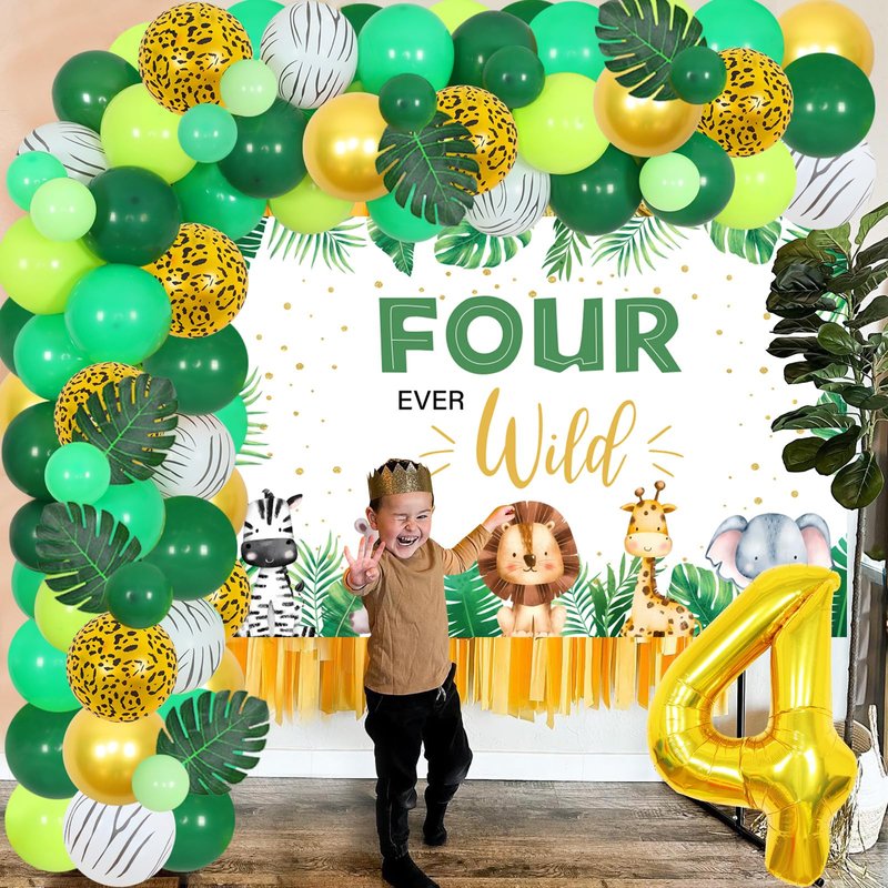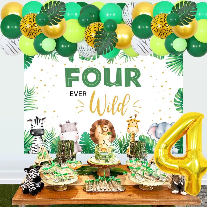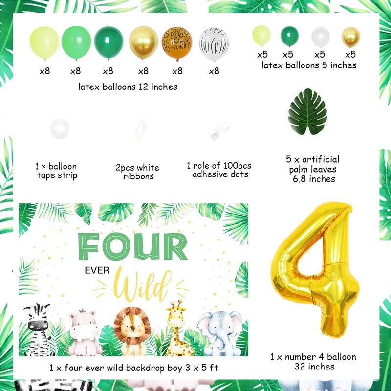 - Jungle Theme 4th Birthday Decorations: Jungle theme 4th birthday decorations include 48 x latex balloons 12 inches, 20 x latex balloons 5 inches, 1 x four ever wild backdrop boy 3 x 5 ft, 1 x number 4 balloon 32 inches, 5 x artificial palm leaves 6.8 inches, 1 x balloon garland strip, 1 role of 100pcs adhesive dots, 2pcs white ribbons