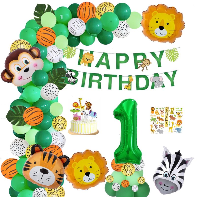 - The set includes: 5pcs 30in animal head balloons,20pcs 12 inch animal pattern balloons, 40pcs 10 inch balloons, 10pcs 5 inch balloons, 1 birthday banner, 1pcs 32 inch large digital balloons, 1 birthday cake decoration,2 tattoo stickers,3pcs simulated leaves, and balloon accessories.