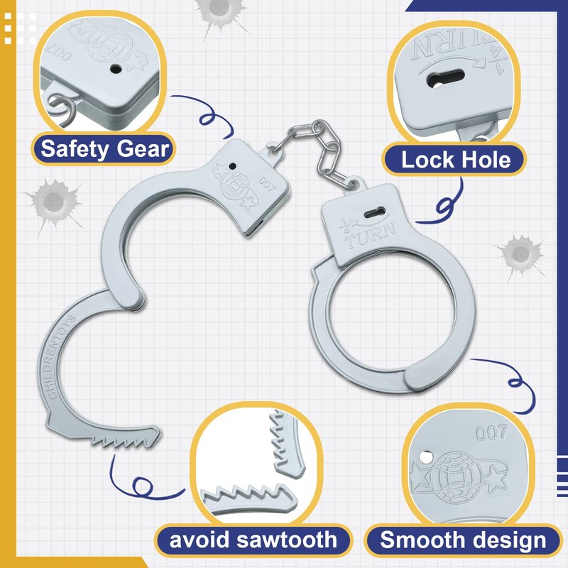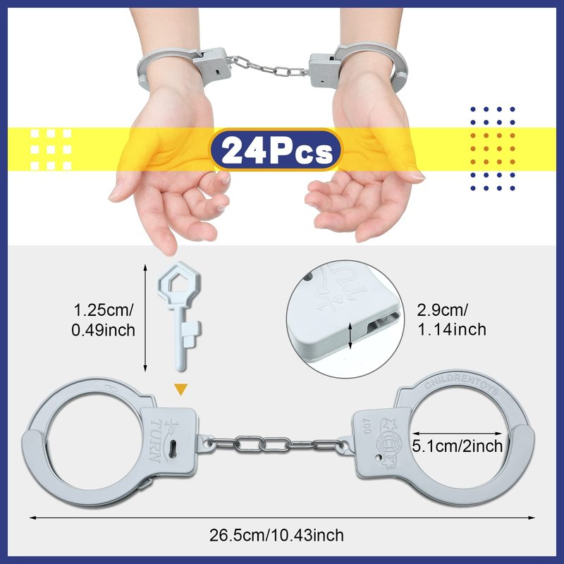 - Package Includes: the set comes with 24 pieces of plastic toy handcuffs and 24 pieces of keys, bring police cosplay to life, great props for police costumes or as stage props to really play the role