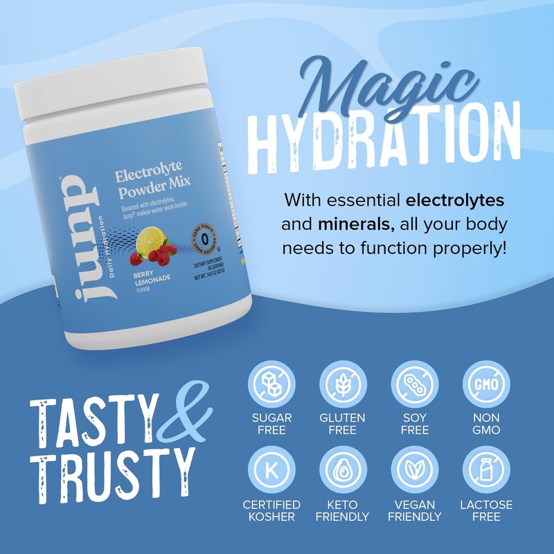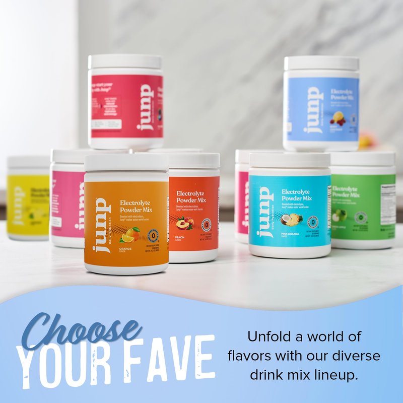 Water tastes better and works better with Junp hydrate electrolyte powder. It’s all you need for maximum hydration every day, with essential electrolytes and minerals your body needs to function properly: Calcium & phosphorus to support bone health, sodium and chloride to retain fluids, potassium and magnesium to support nerve and muscle function. Available in 9 exciting flavors, We’re sure this will be the best electrolyte powder you’ve tasted. FEATURES & BENEFITS: Sugar Free Gluten Free Soy Free Zero Calories Zero Carbs Keto Friendly Vegan Friendly Lactose Free No Artificial Colors or Flavors No Animal Byproducts Non-GMO Certified Kosher AVAILABLE FLAVORS: Peach Pina Colada Berry Lemonade Lemonade Dragonfruit Limeade Wild Berry Orange Grape Green Apple JUNP FOR YOU Whether you’re running a marathon or running errands, Junp helps replenish the essential electrolytes and minerals your body loses when you sweat. Drink Junp daily to help achieve your body’s optimal state. Fuel athletic performance, enhance recovery, reduce cramping and soreness, and return to health faster. PREVENT DEHYDRATION Alleviate fatigue and avoid dehydration during intense physical activity, hot weather, or strenuous working conditions. Reclaim your sapped energy, reenergize before working out or tackling the tasks on today’s To-Do List. AUTHENTIC FLAVOR, SANS THE SUGARS Rejoice in heightened hydration minus the unwanted sugars, carbs, and calories. Savor authentic fruity flavors thanks to stevia leaf extract and real fruit extract infusions, with plant-based colors and nothing fake or non-natural. Vegan, gluten-free, keto-compatible, paleo-approved, and free from artificial sweeteners. Junp helps you hit dietary potassium targets when following a low carb diet. Your body will thank you. Your taste buds will love you. Don’t just hydrate, elevate. Take a Junp. Now you can stock up using our bulk electrolyte powder 2 packs.