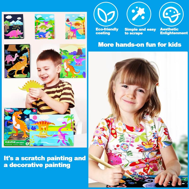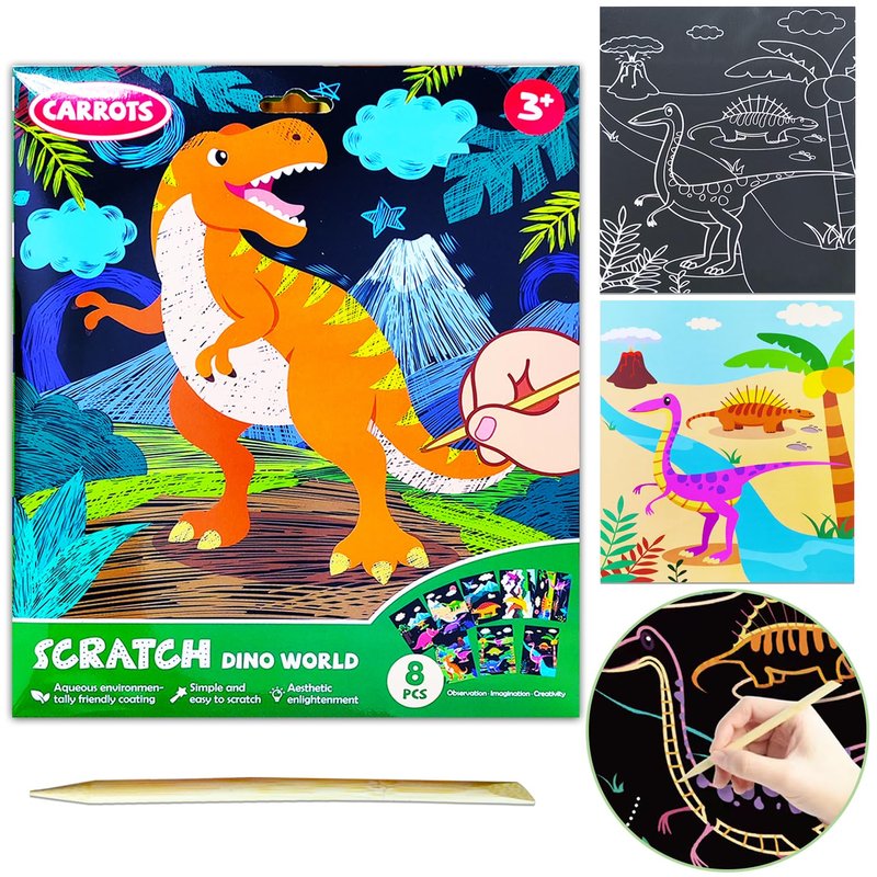 - ✍【Scratch Paper Art Set Includes 】8 Dinosaurs Scratch Pictures, 1 Wooden Styluses, Expandable, beautifully presented box (with thoughtful handling advice).