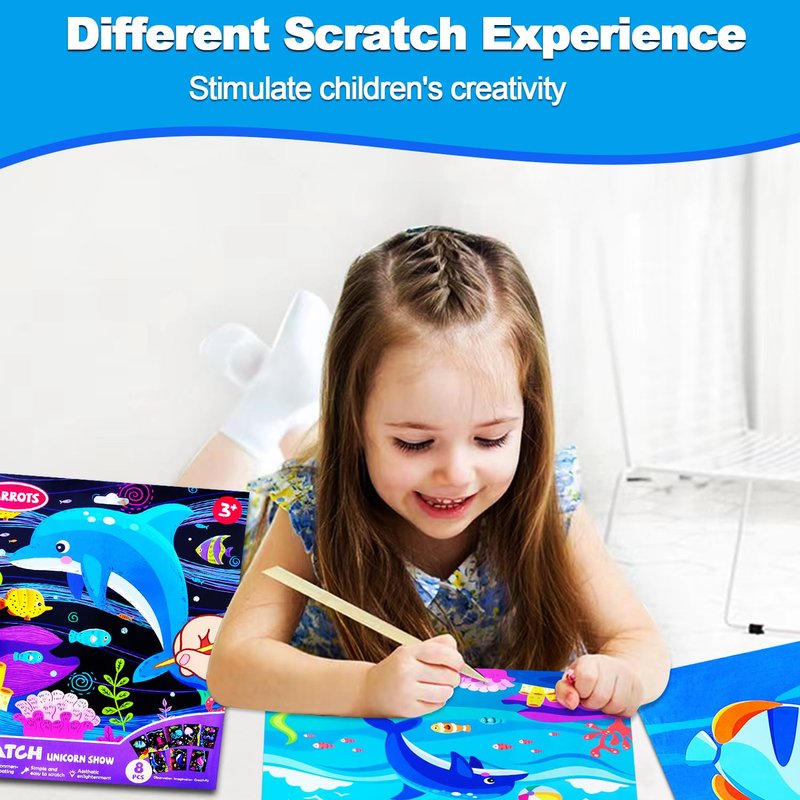 - ✍【Magic Scratch Art 】Scratch the surface of the black scratch paper with a wood stylus tools to reveal a hidden world of vibrant and magical colors. The magic scratch paper is a ocean animals design that kids love so much, scratch the surface to get an scratch paper art set. Even the same scratch pattern can create different effects! Everyone can take the time to play, think, test and prepare for their masterpieces.