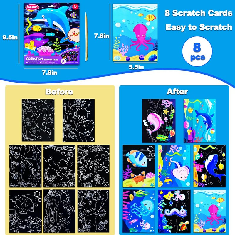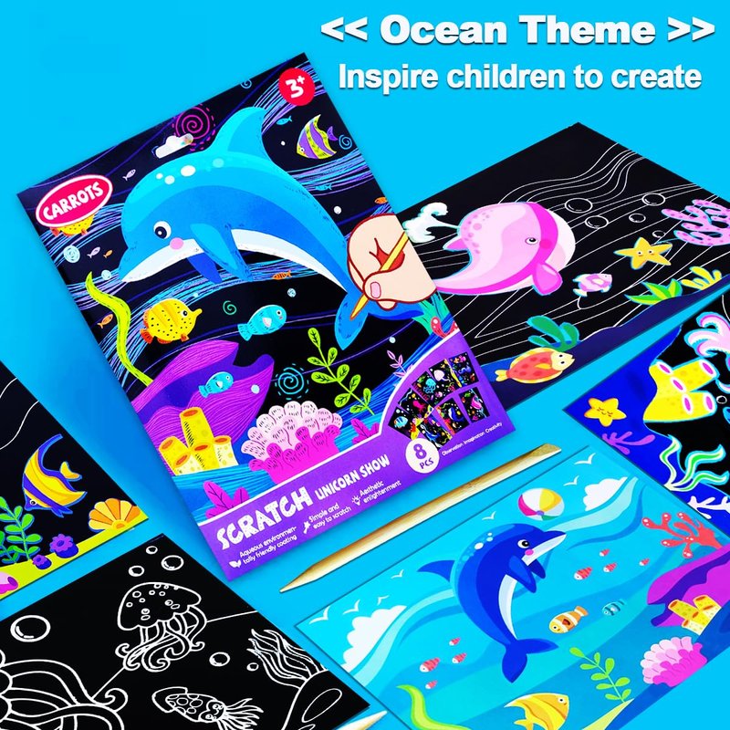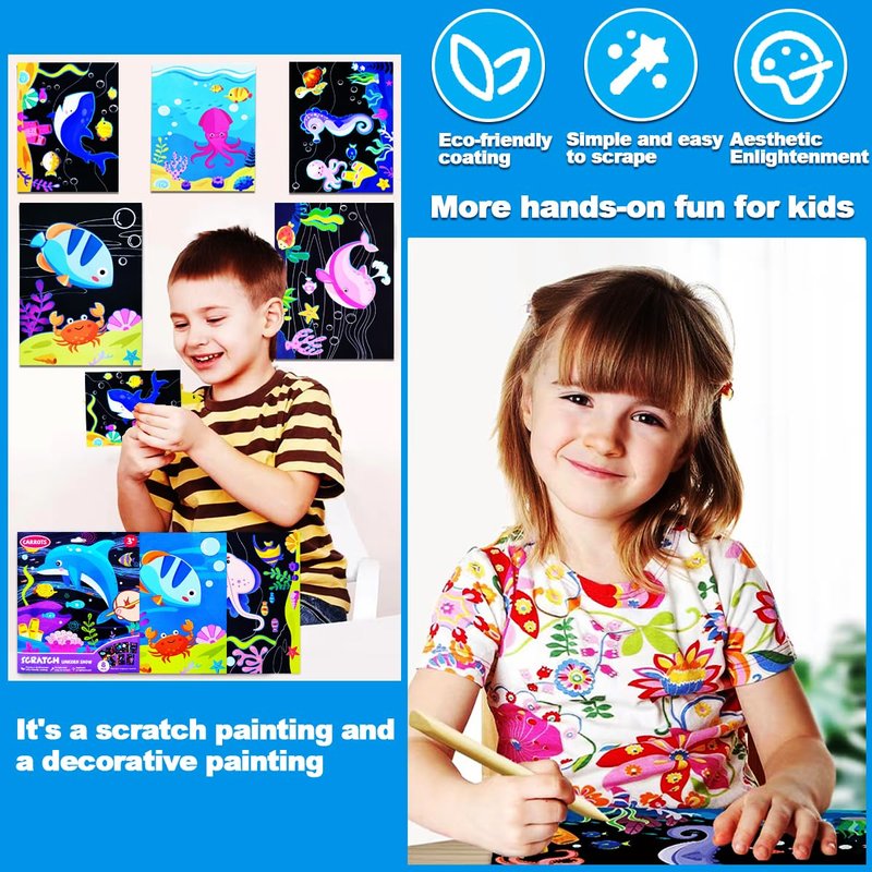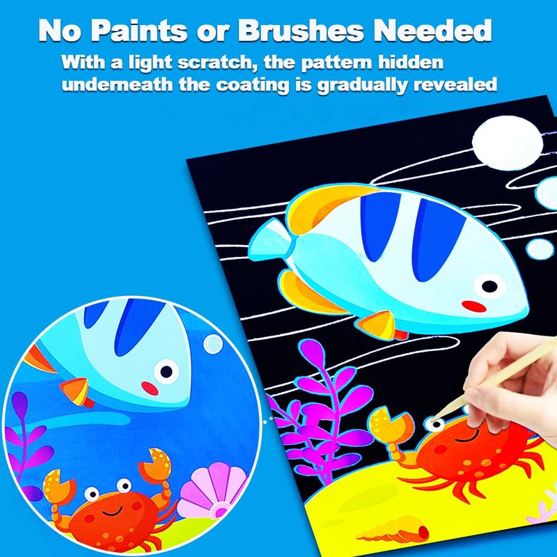 - ✍【Ocean Animals Art Crafts】This arts & crafts supplies provides hours of creative fun and makes an crafts gift for kids ages 4-8 who love sea animal! The scratch art for kids is compact and perfect for all kinds of travel - road trips, flights, and train rides.