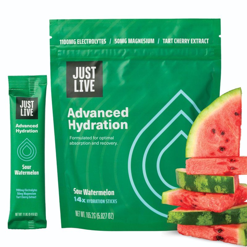 Just Live Advanced Hydration - Sour Watermelon, Electrolyte Drink Mix, Tart Cherry Extract, Supports Recovery & Absorption, Low Sugar, 14 Pack