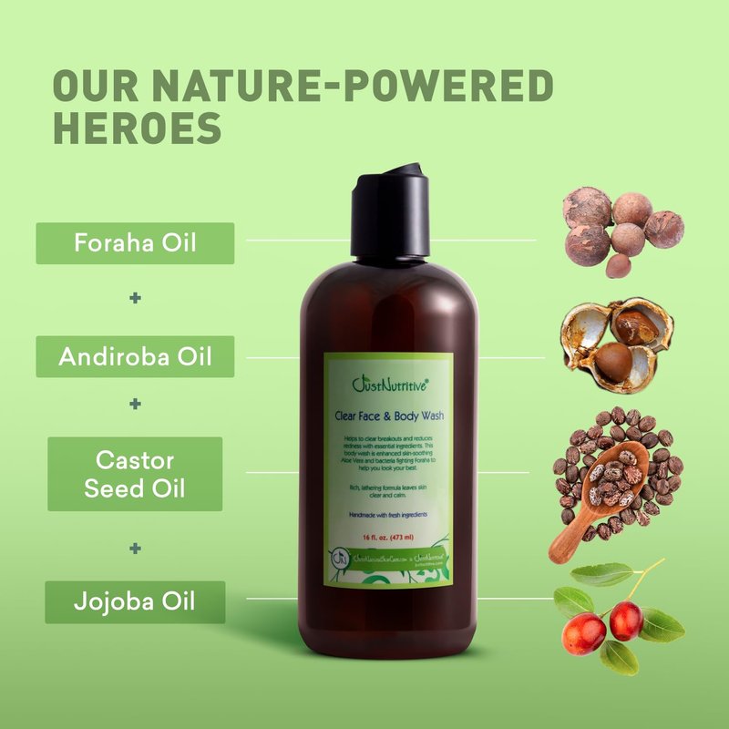Look great and feel better in every wash with Just Nutritives’s Acne Clear Face & Body Wash. The extra-gentle formula of this acne face wash removes dirt and oil without harsh ingredients that can dry or irritate your skin. This helps moisturize and clear your skin without clogging the pores. This acne treatment body wash cleanses the skin to reduce blemishes and leaves the skin moisturized and fresh. Boosted by nutritive ingredients, it can penetrate deeply to balance your skin. This gentle acne wash is good for all skin types. This adult acne cleanser has Foraha Oil that helps remove unwanted dead skin cells & leave a moisturized clean feel. Castor Seed Oil helps cleanse the skin to reduce blemishes. Andiroba Oil replenishes dry skin & can help achieve clear skin. Jojoba Oil controls the production of excess sebum without clogging pores & Tangerine Essential Oil builds a healthy moisturizer to keep skin soft without removing any oils from the skin's protective barrier. With the help of nature’s power, this hypoallergenic and non-comedogenic formula will get your skin free of breakouts. At Just Nutritive, we use no animal ingredients or do any animal testing. We assure you that every bottle is handmade with love in the USA and made of Earth’s purest ingredients. Together, let’s nourish with nature.